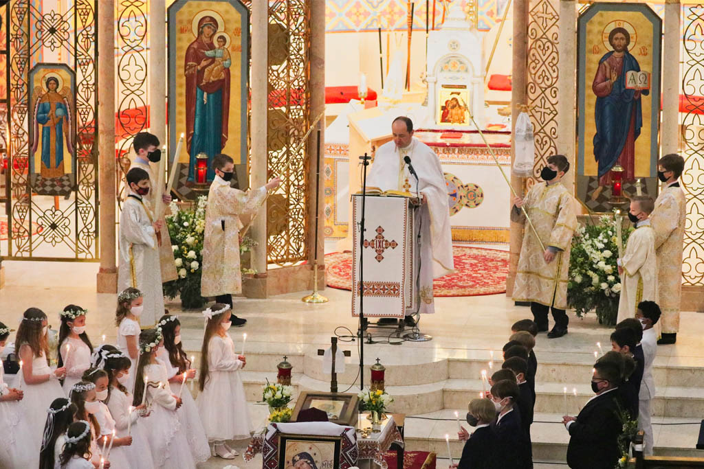 On Sunday, May 9th, 2021, Mother’s Day, the children came to church and were greeted in the vestibule by Fr. Serhiy. He lit the candle each child held symbolizing the banishment of the darkness of sin from their lives and to remind them that Christ is the light that will shine a path for them in life if they continue to follow His words. During the Divine Liturgy they received the Precious Body and Blood of Our Lord through the Mystery of the Holy Eucharist. The Holy Bread broken and joined with wine in remembrance of the body and blood of Jesus that was broken and poured at the cross when He gave His life for the forgiveness of their sins. Receiving the Holy Eucharist does not only remind us of Christ’s suffering but also shows us the amount of love Christ had for us. By receiving the spiritual body and blood of Christ, He lives in us and us in him. We connect with Jesus Christ not only in the memory of his death, but in the spiritual life he gives to us through this Holy Mystery. There is no more precious gift that these children can receive than the one they did on Sunday.